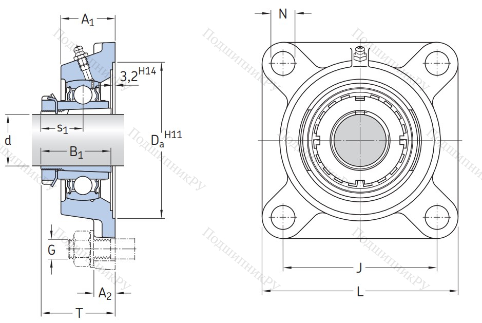 Данная шарикоподшипниковая серия оснащена квадратным чугунным, каучуковым или прессованным стальным фланцем, корпусом F-серии и подшипником UK-типа с закрепительной втулкой разновидности H.